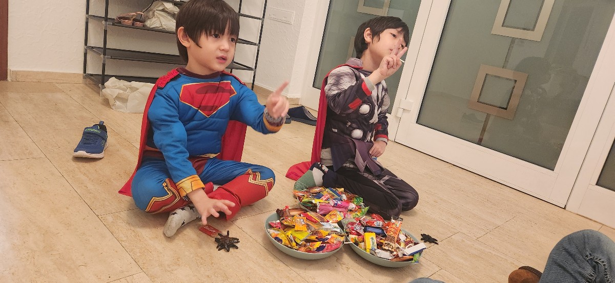 잔뜩 쫄아가지고..ㅋㅋ 해피 할로윈을 시작한 우리 슈퍼히어로 아들들. 슈퍼맨과 토르.
