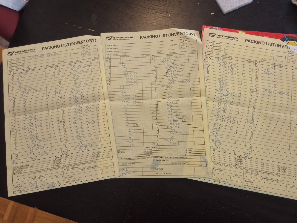 컨테이너에 차도 함께 들어가는터라 살림살이를 다는 못 실었다만 그래도 153상자가 나왔었다. 이미 이사짐을 한국에서 쌀 때 명단을 받았었고, 최대한 빠르게 일을 끝내야 할 것 같았다. 한국에서 남편 말만 믿고 있다가 주방용품 대부분을 못 실었고 내 여름옷은 아예 못가져왔던 터라 이번에는 최대한 실수를 줄여보기로 함.
