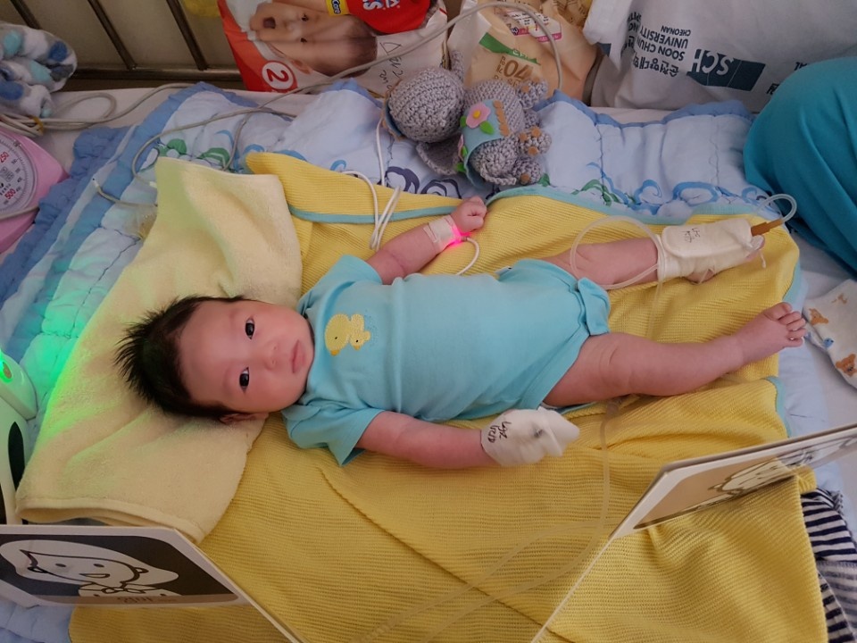 목사님께서 오셔서 유아세례를 침상에서 받았다. 이날은 피수치도 급격히 떨어져서 수혈을 받았다.