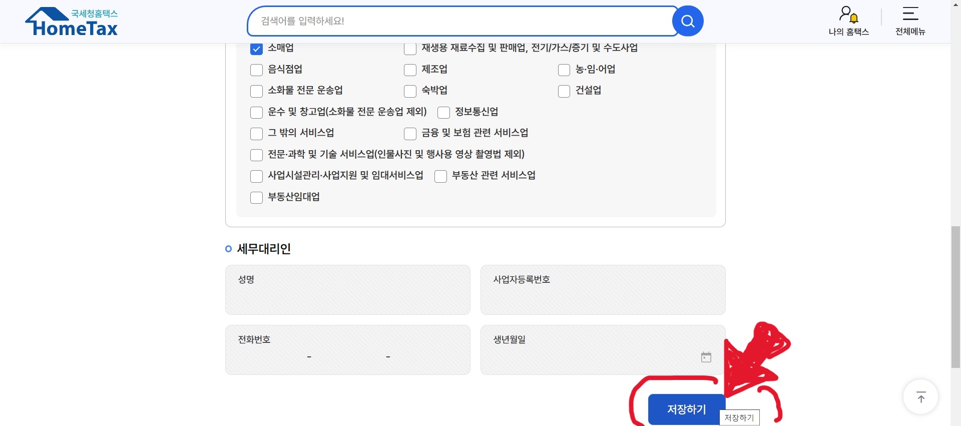 간이과세자를 누르고 사업자 등록번호에 확인란을 누르면 사업자 정보가 뜬다. 저장하기 누른다.