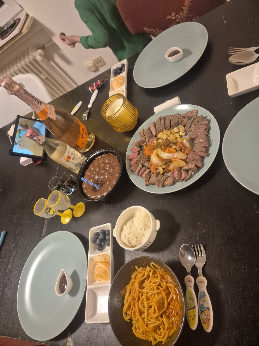 나름 스테이크랑 스파케티랑 샴페인, 뭐 갖다놓을 수 있는건 다 갖다놔봤다. ㅋㅋㅋ